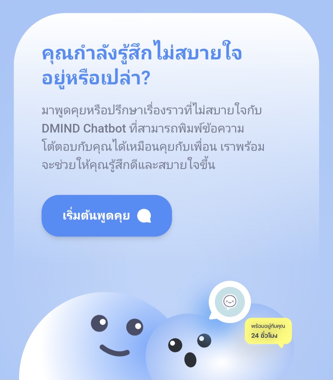 LLM based mental health support chatbot in Thai. Currently, Dmind Chatbot is continue researching and developing under Center of Excellence in Digital and AI for Mental Health (AIMET) Radchaneeporn Changpun, Naphat Khoprasertthaworn, Pipat Jongpipatchai, Theerin Petcharat, Krittapas Rungsimontuchat