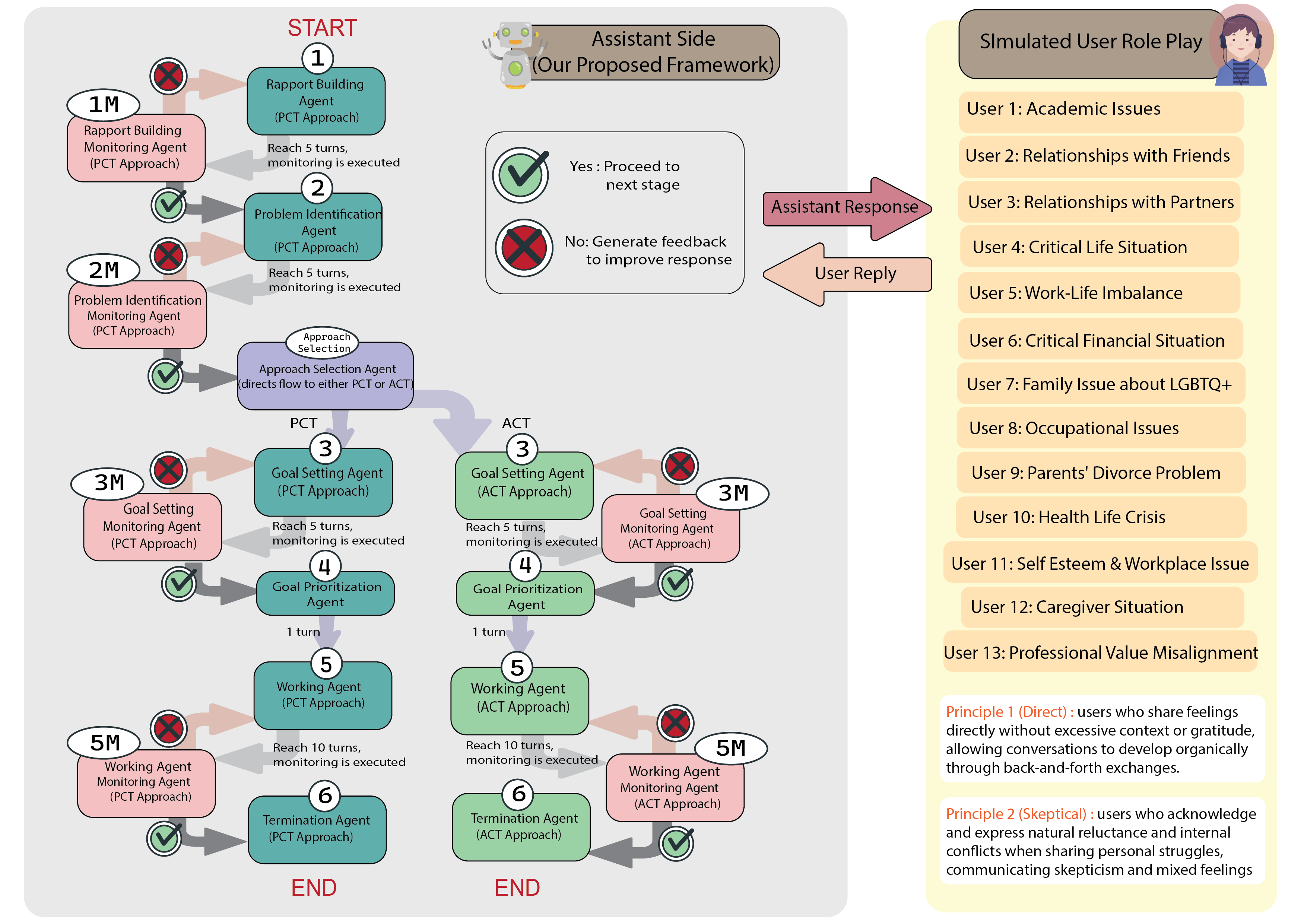 We developed an agentic stage-based LLM framework that guides conversations through five counseling stages, drawing from Person-Centered Therapy and Acceptance and Commitment Therapy. Our system uses three specialized types of agents: stage based agent for each framework stage, another one approach selection agent selects appropriate counseling approaches, and monitoring agent manages stage transitions. The framework achieved a 79% positive user reaction rate, significantly outperforming baselines. Real user testing and evaluation by counseling practitioners confirmed improvements across seven of eight mental health support metrics, demonstrating potential for scalable LLM-based mental health support in Thailand.